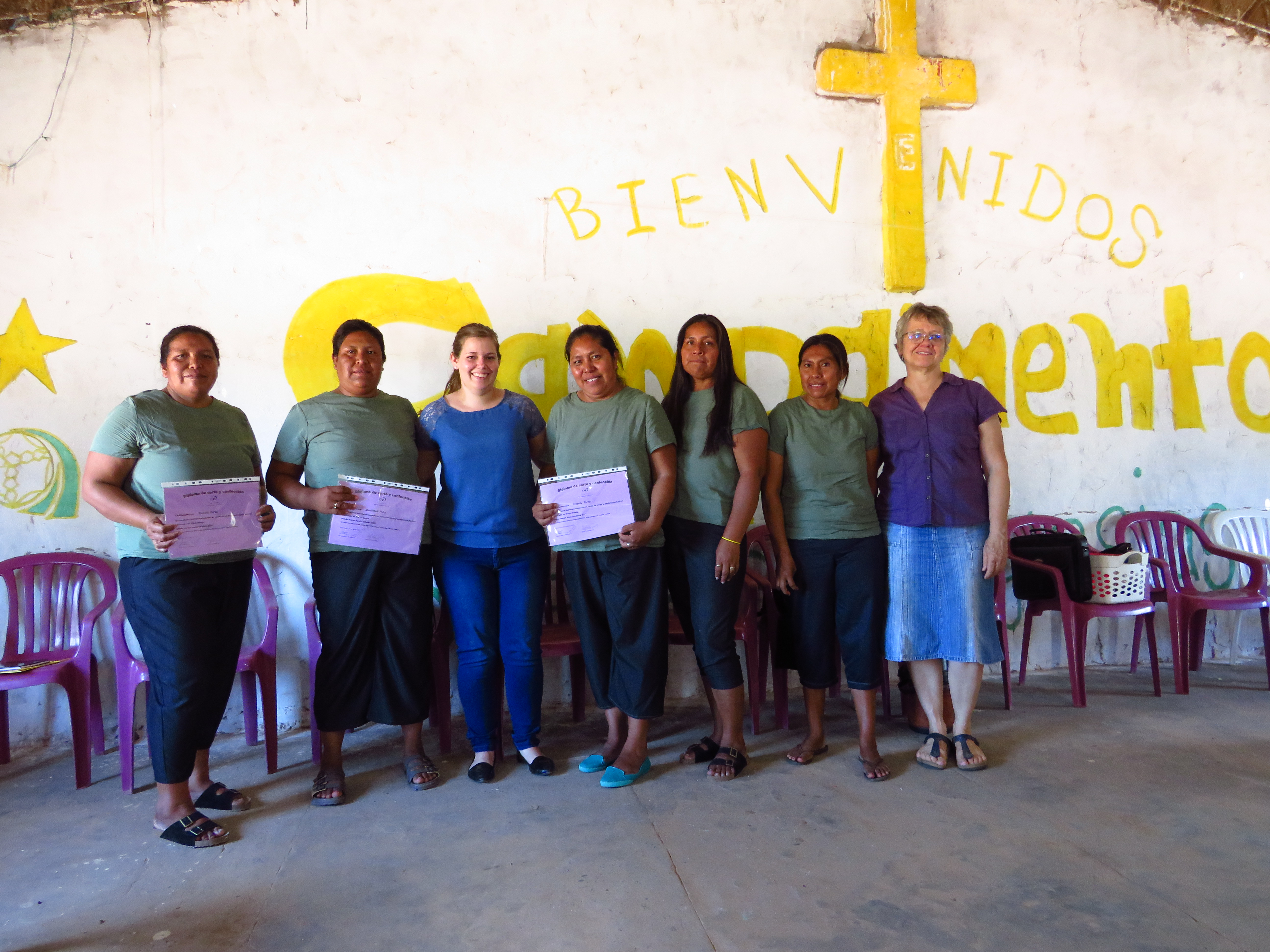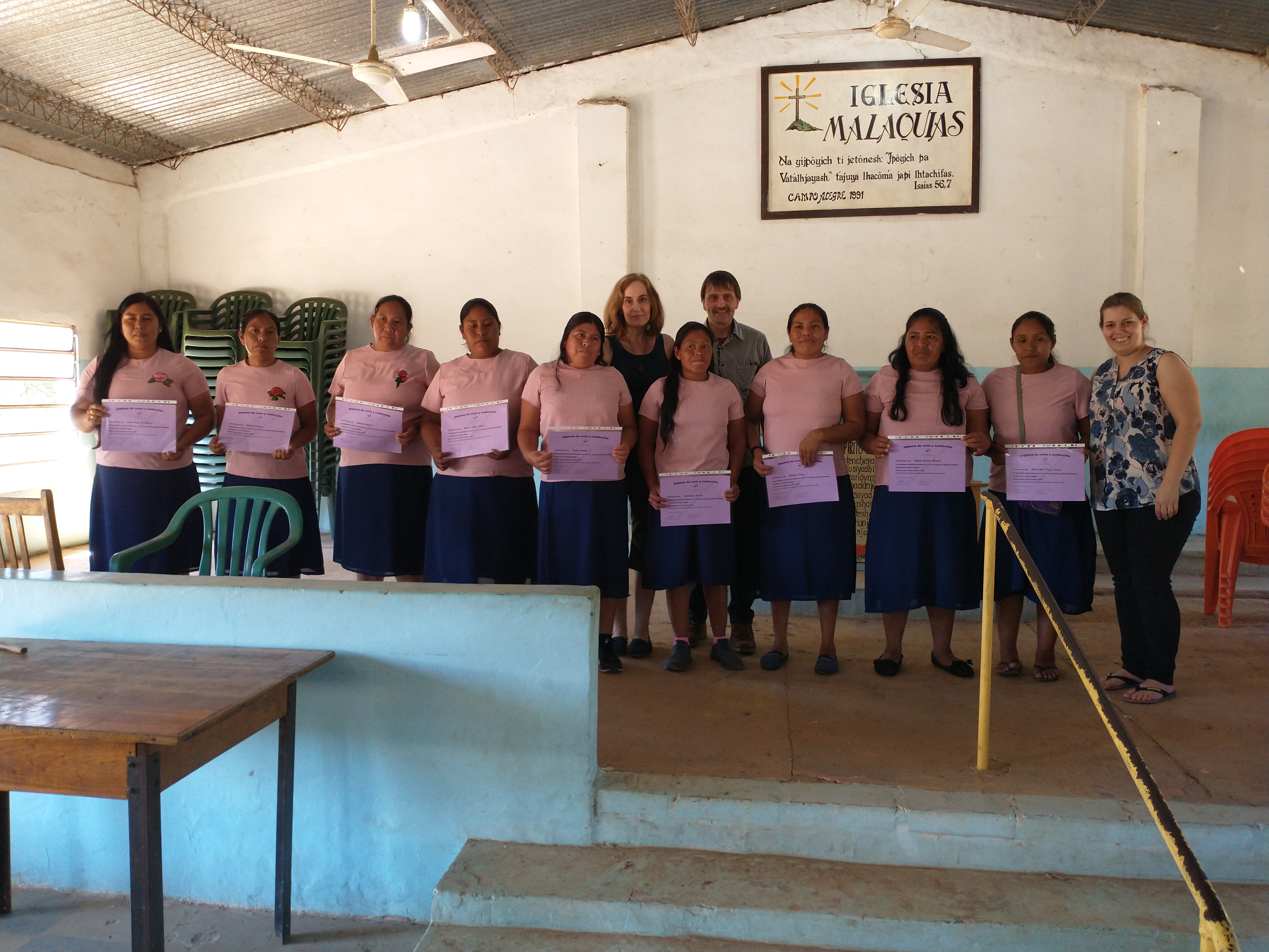 A las 14:00hs se celebró la clausura del curso básico en costura en la iglesia Éfeso de la Comunidad Enlhet Yalve Sanga. La bienvenida fue dada por la lideresa de mujeres de la aldea Éfeso, Nenita de Ayat. Luego, la instructora de costura de la ASCIM, Bianca Wiens de Löwen presentó a las mujeres absolventes. Dos de las mujeres compartieron sus experiencias, manifestando su gratitud por la oportunidad de participar de un curso de costura. Comentaron que fue uno de sus sueños y que en este año lo pudieron cumplir. El grupo de mujeres que culminó el curso consistió en dos mujeres del pueblo Enlhet y en cuatro mujeres del pueblo Nivaclé.